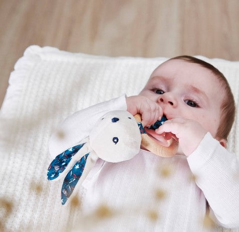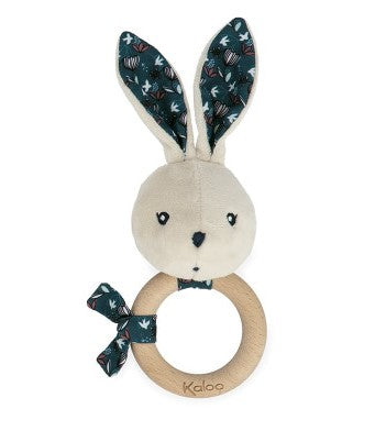 Grazie al suo anello in legno liscio, il neonato potrà afferrare facilmente questo morbido coniglio con sonaglio da 12 cm. Il campanellino all'interno della testa stimolerà in particolare l'udito del neonato. Il grazioso nastro dai colori della natura conferisce un tocco di delicatezza al prodotto.