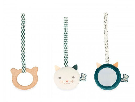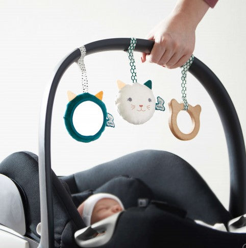 Sviluppato in collaborazione con professionisti della psicomotricità, questo set di accessori multisensoriali portatili è facile da trasportare e appendere ovunque per stimolare il neonato sin dalla nascita. Queste 3 forme di gatto con colori e materiali differente (legno di faggio, peluche con campanellino, specchio) permettono di sviluppare la vista, l'udito, il tatto e la presa. Gli accessori sono facili da appendere grazie a nastrini, e possono essere agganciati agli archi di una palestrina, un tappetino multiattività, un passeggino o un seggiolino. Lavabili in lavatrice a 30°C.