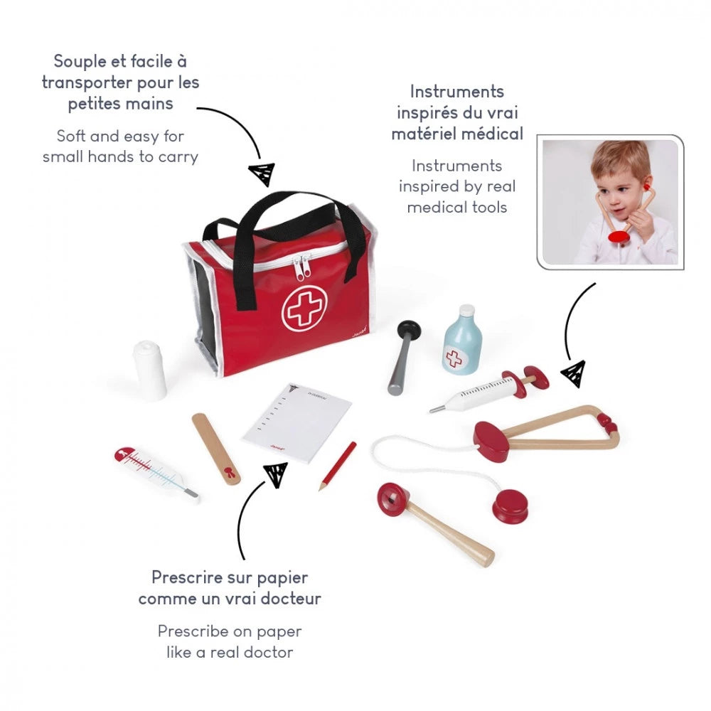 Dica trentatré! Questa bellissima valigetta da medico per bambini dai 3 anni permetterà ai più piccoli di diventare il grande medico che hanno sempre sognato di essere. Grazie ad accessori in legno massello molto realistici, i bambini potranno prendersi cura di tutte le piccole bue dei loro cari. Questo gioco permetterà loro di acquisire fiducia imitando il più grande. Questo set contiene una siringa dotata di una molla interna, un martello per controllare i riflessi, una bottiglia di disinfettante, uno stetoscopio, un otoscopio dotato di una lente d'ingrandimento, un termometro, una linguetta di legno, un quaderno di prescrizioni del Dr. Gueritou (30 pagine) con una matita di carta e un rotolo di benda. Tutti questi accessori del medico perfetto sono conservati in una graziosa custodia con cerniera per poter trasportare tutto facilmente.