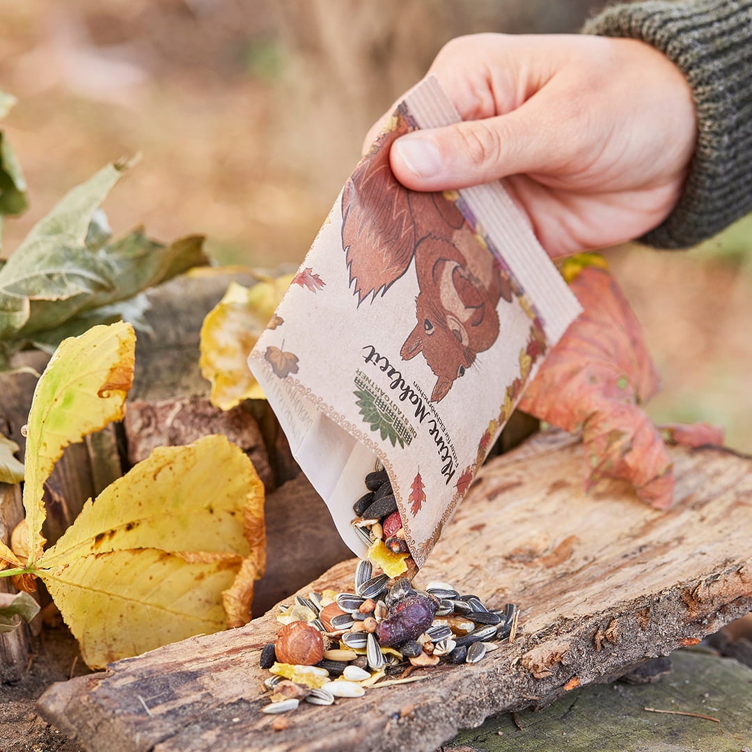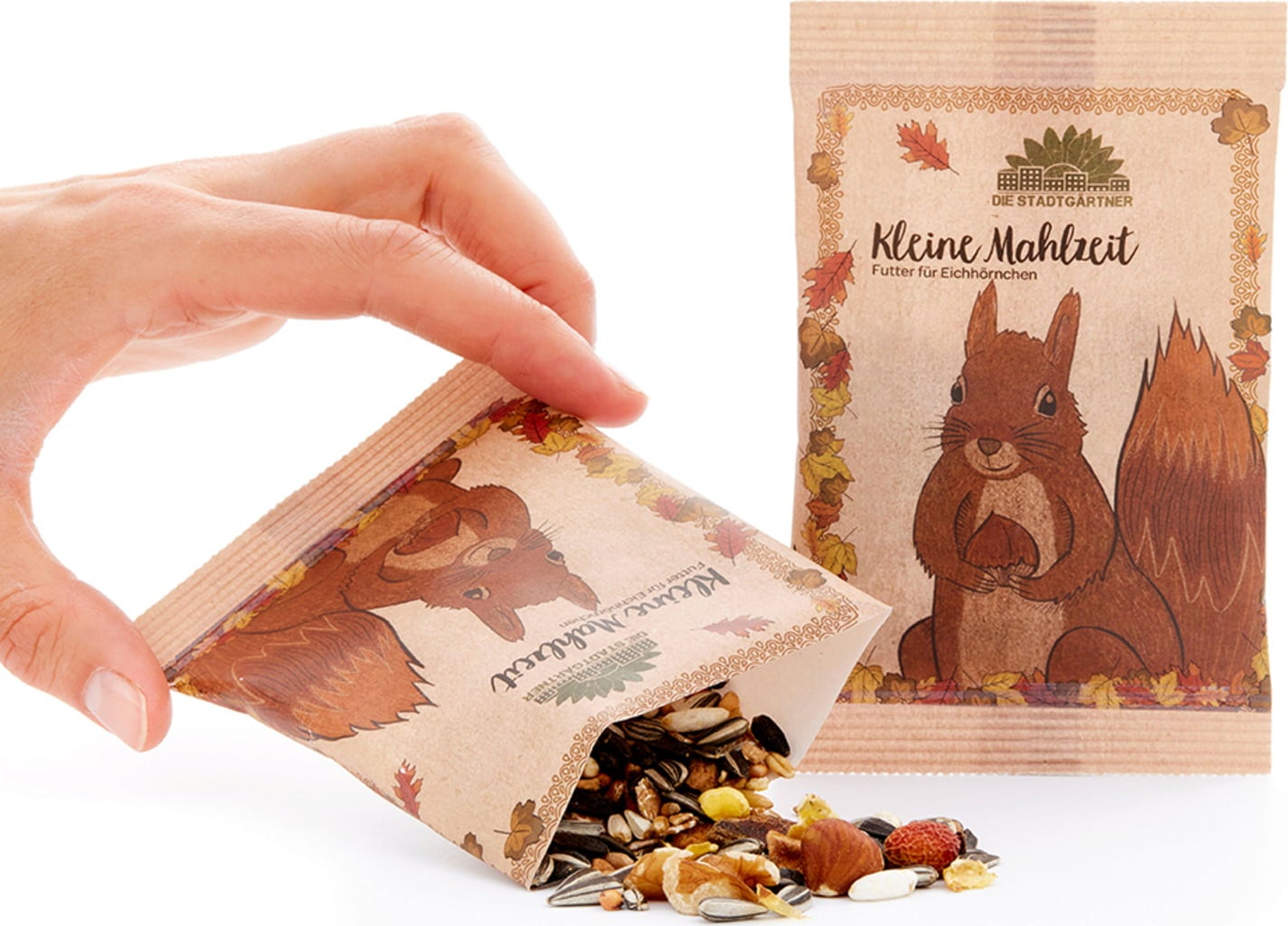Gli scoiattoli piacciono proprio a tutti: con le loro code morbide e voluminose e i movimenti agili e veloci. Sono anche dei veri amici dell'ambiente e soprattutto dei boschi. Questo spuntino è l'ideale per offrire loro un posticino comodo e sicuro in cui rilassarsi e fare provviste per l'inverno. Metti un piatto piano in una zona riparata e versa il mangime. La miscela contiene: nocciole, noci, rosa canina, uvetta e semi di pino siberiano.