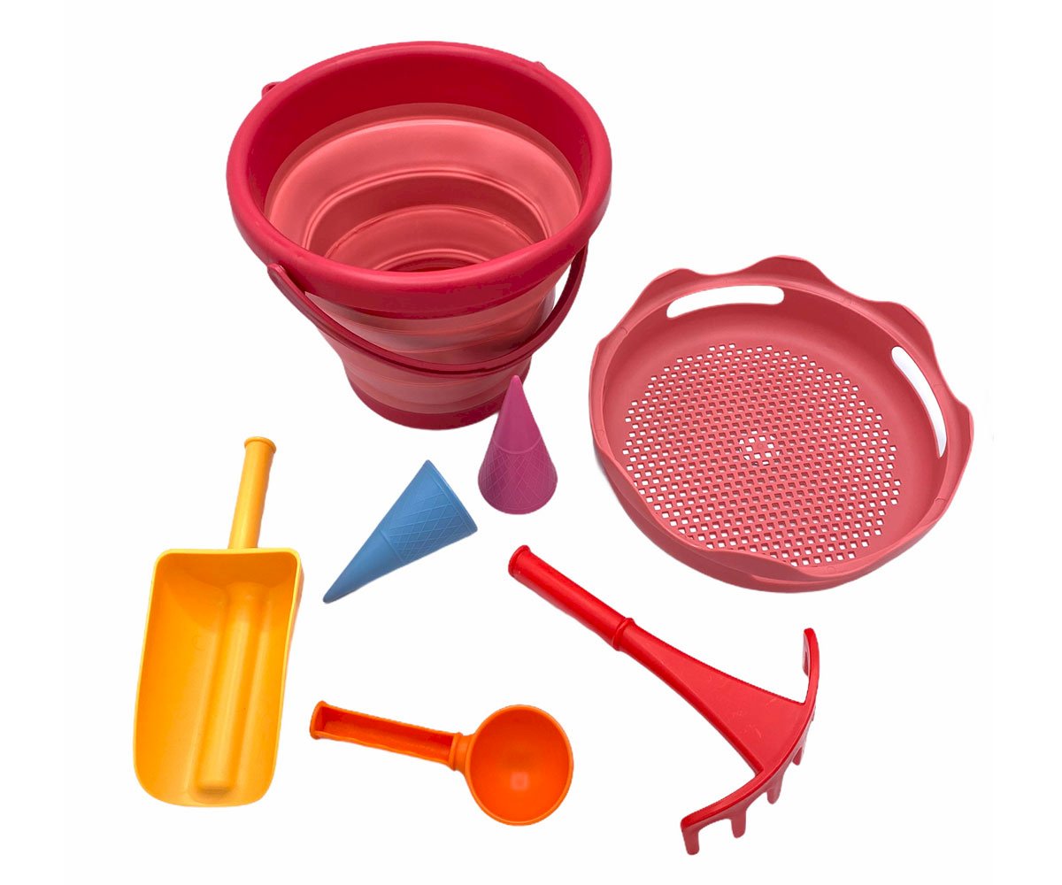 Paletta, formine, setaccio, rastrello e secchiello pieghevole per trasportare tutti i pezzi in modo compatto, per passare una bella giornata alla spiaggia.