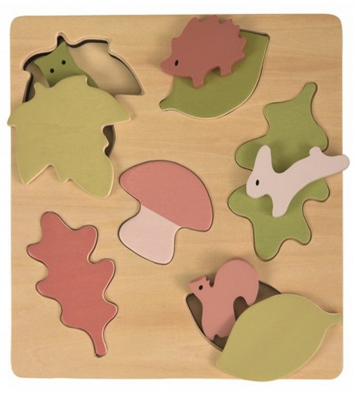 Cosa si nasconde sotto le foglie nella foresta? Dai un'occhiata e scopri la vita segreta. Un adorabile giocattolo per imparare e sviluppare la destrezza. Ecologico e sicuro per i più piccoli. Legno.