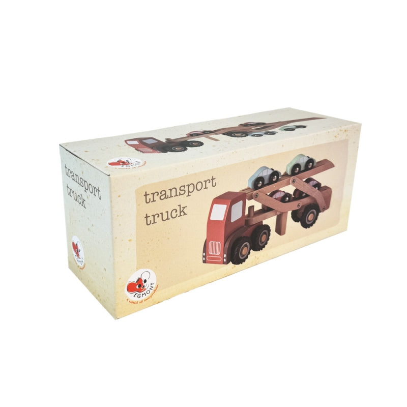 Camion bisarca in legno robusto con 4 automobiline in legno. Attenzione, arriva la tua nuova macchina! Carica e scarica.
