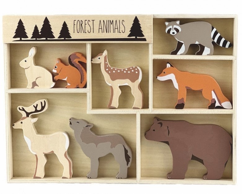 Questa scatola di legno contiene un incantevole set di otto animali del bosco. Perfetto per incoraggiare il gioco immaginativo o decorare una stanza a tema foresta. Legno FSC.