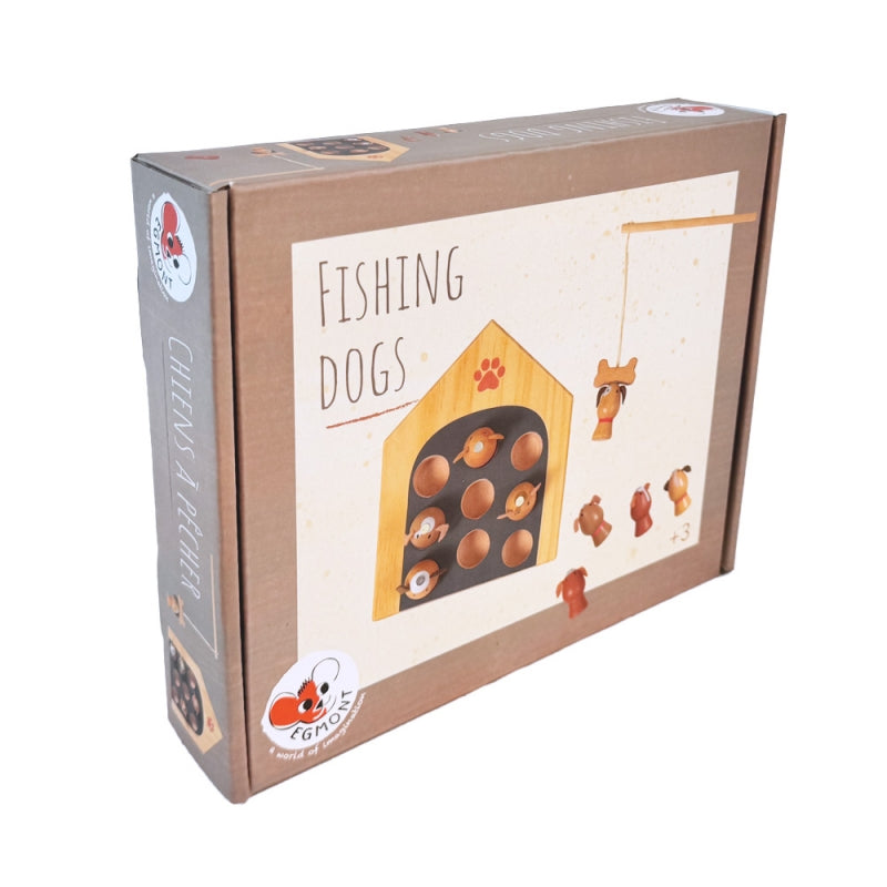 Gioco di pesca con 9 cagnolini in legno. Prendi una canna da pesca con il piccolo osso magnetico e prova a catturarli tutti il più velocemente possibile. Gioco educativo di destrezza. Legno.