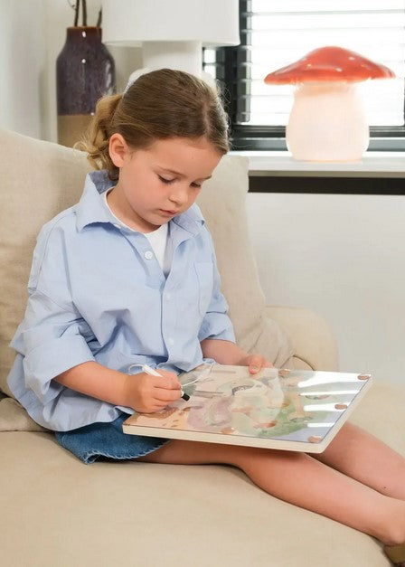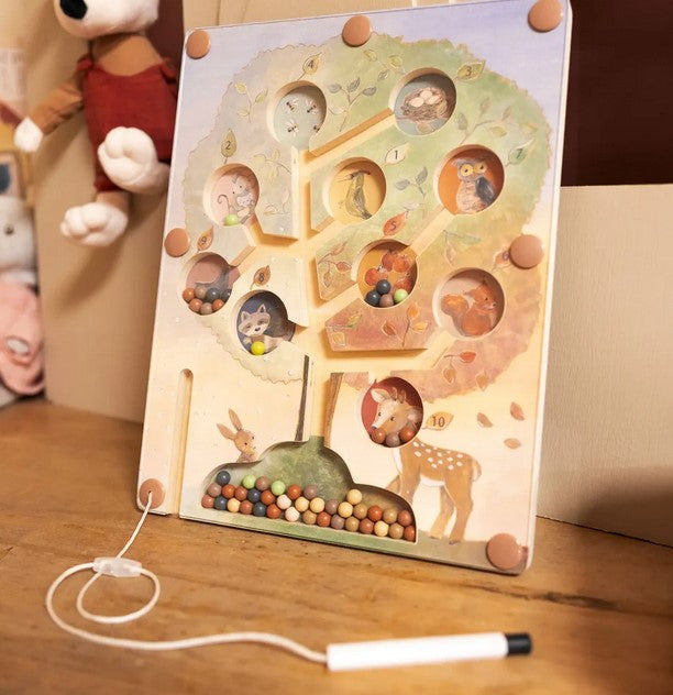 Guarda le piccole dita guidare coloratissime perline di legno attraverso i canali intrecciati dell’albero, con una magica bacchetta magnetica. Ogni tasca custodisce un diverso amico del bosco — cervo, gufo, volpe e coniglio — pronti ad accogliere le loro speciali perline in questa incantevole avventura labirintica.