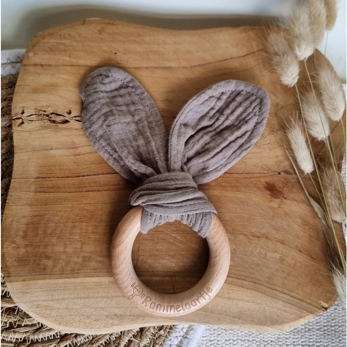 Il classico regalo per bambini alla nascita: un anello da dentizione in legno. Il nostro modello è facile da afferrare per i più piccoli e presenta un dolce dettaglio con orecchie di coniglio in mussola.