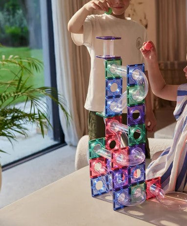 Questa pista a biglie Cleverclixx in colori pastello contiene 70 pezzi. Con questo set, puoi subito iniziare a costruire con le nostre tessere magnetiche. I magneti hanno qualcosa di magico e stimolano l’immaginazione dei bambini. La creatività e la fantasia del tuo bambino sono completamente libere di inventare costruzioni e giochi divertenti con il set Cleverclixx preferito. Tutti i set sono compatibili tra loro, quindi puoi sempre espandere. Cleverclixx cresce anche con il tuo bambino. Dai 3 anni può iniziare a imparare il concetto di costruzione 3D. Crescendo, potrà creare costruzioni sempre più complesse e, alle elementari, diventa persino uno strumento utile per esercizi di matematica. Ancora meglio! Costruisci contro il termosifone o altre superfici magnetiche e crea un'opera d'arte verticale. Oppure disegna lettere e numeri con pennarelli cancellabili e scatena la creatività con i set Cleverclixx Magnetic Building.