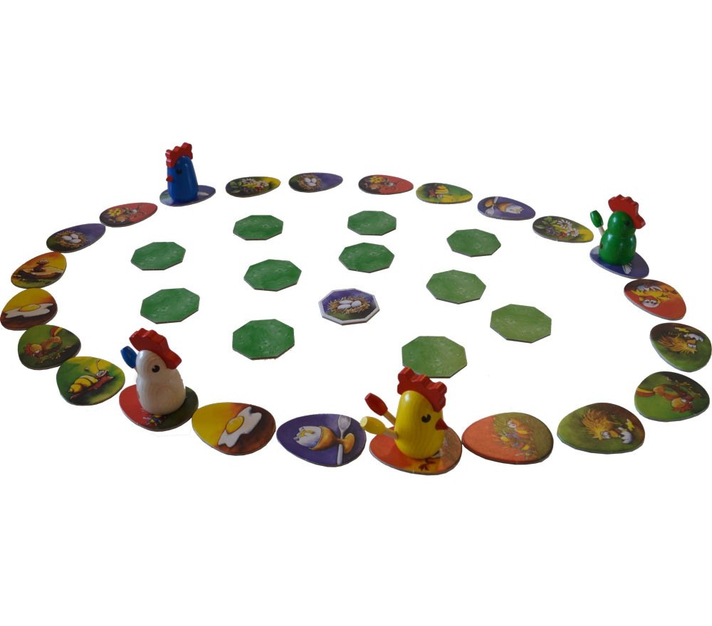 Elementi di Gioco: 24 Tessere a forma di Uovo, 12 tessere ottagonali, 4 polli in legno, 4 code di legno.