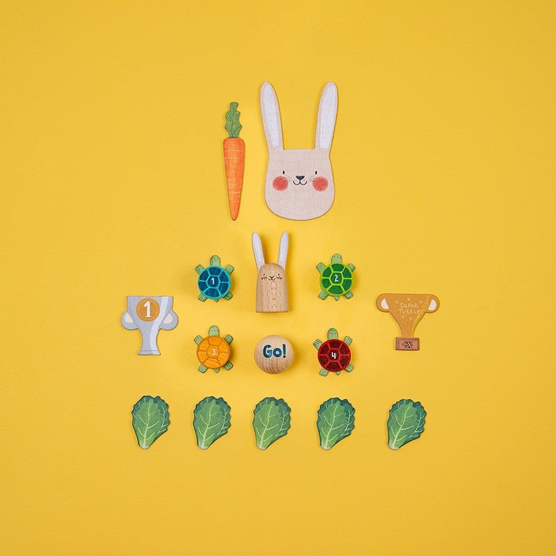 Un gioco cooperativo molto divertente ispirato alla favola della lepre e della tartaruga, dai 5 anni in su. Gioco sostenibile in cartone e legno. Prodotto a Barcellona.