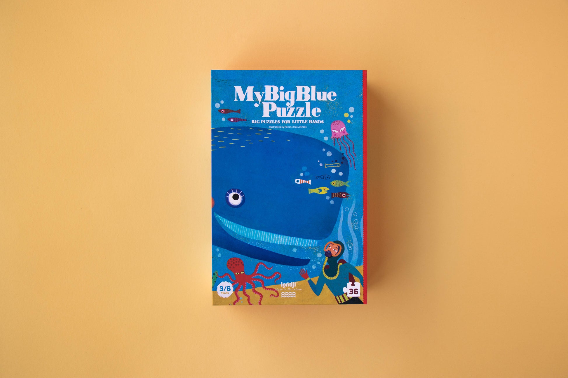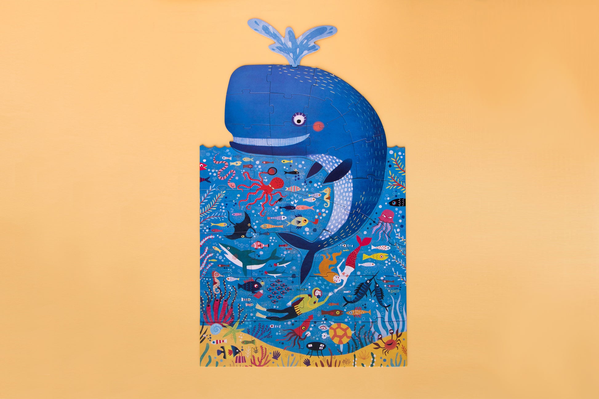 Tuffati nell'oceano di Londji, naviga accanto alla grande balena blu, immergiti circondato da squali e innamorati della bellissima regina dei mari. Il puzzle ci permette di assemblare la balena dal fondale marino separatamente, facendo parte di una collezione di puzzle in cui i protagonisti sono animali molto grandi. Un puzzle sagomato da 36 pezzi con protagonista una balena, che ci permette di esplorare il mare profondo. Un giocattolo sostenibile e di prossimità.