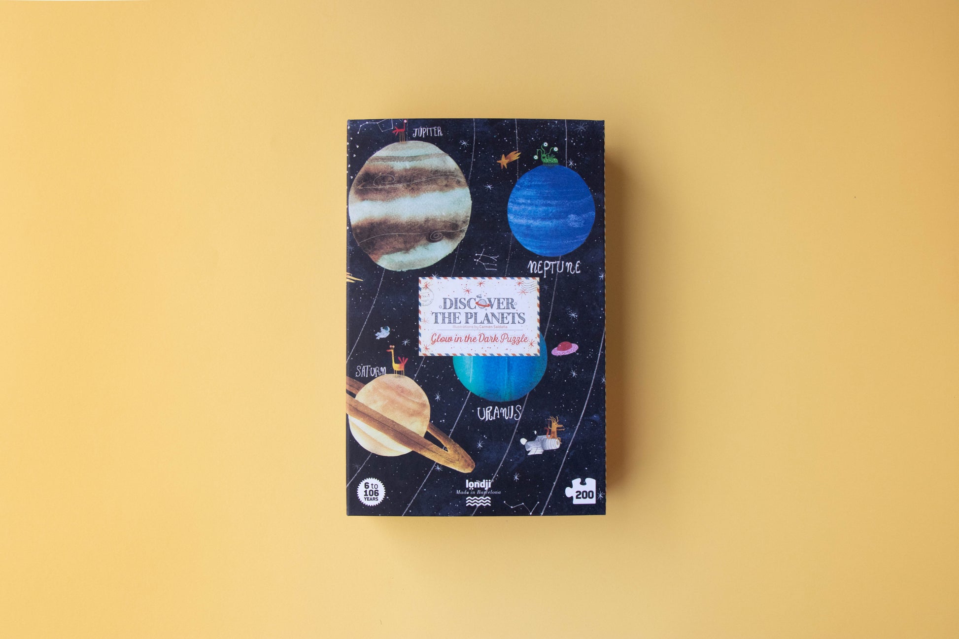 Da Giove a Marte, da Urano a Saturno, dalla Terra a Marte. Viaggiamo attraverso il sistema solare con questa illustrazione di Londji. Un puzzle da 200 pezzi che si illumina al buio, un sistema solare con una sorpresa! Per bambine e bambini dai 7 anni.