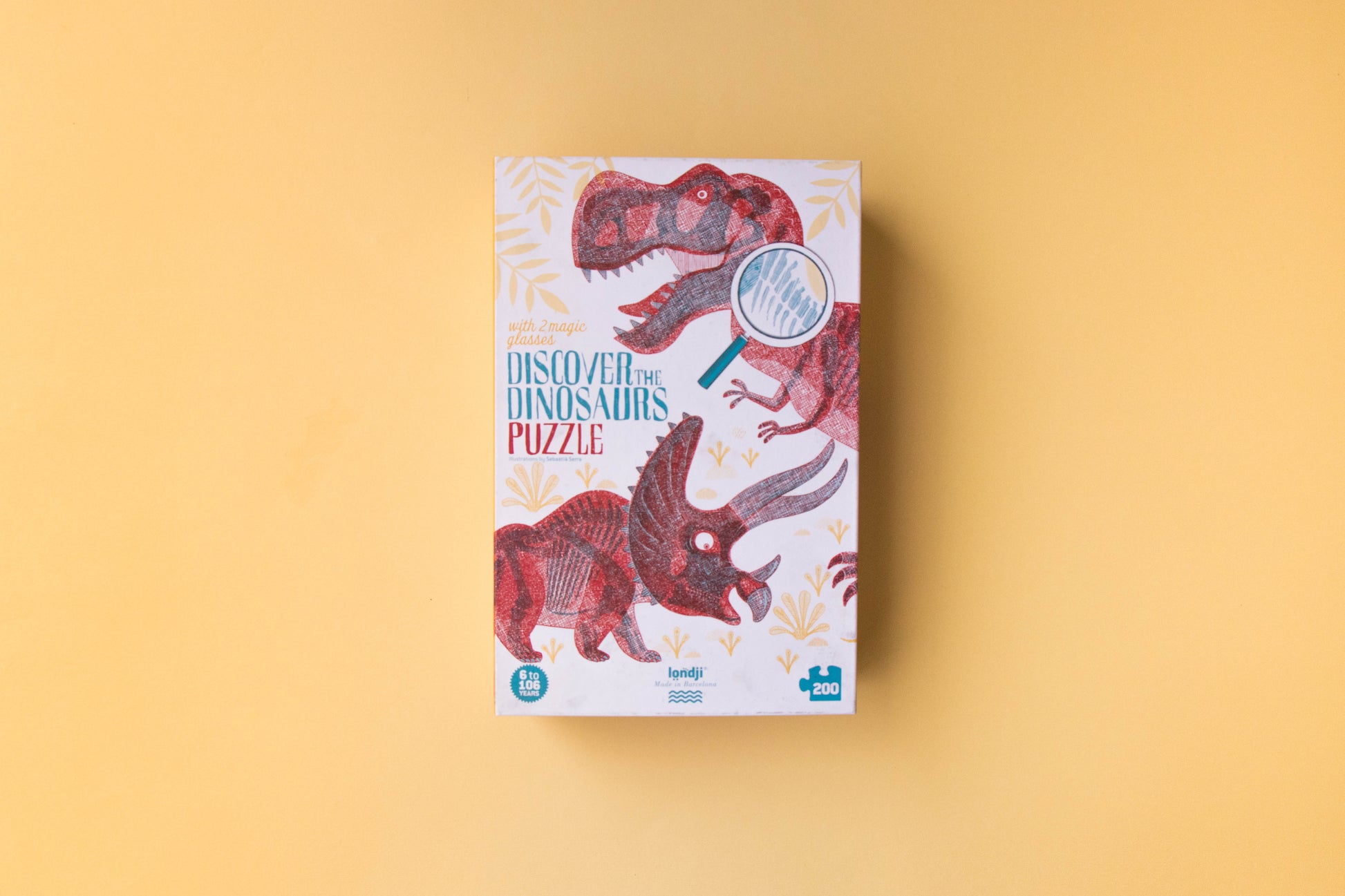 Guarda attraverso la lente d'ingrandimento blu e viaggia nel Giurassico di Londji. Scoprirai impressionanti Tyrannosaurus Rex, diplodochi e spinosauri che camminano in mezzo ai vulcani. Ora prendi la lente d'ingrandimento rossa e vedrai come le ossa fossilizzate di questi giganti sono diventate parte del museo di scienze naturali. Un puzzle molto originale, con una lente d'ingrandimento rossa viaggerai nel periodo Giurassico e con la lente d'ingrandimento blu scoprirai il museo.