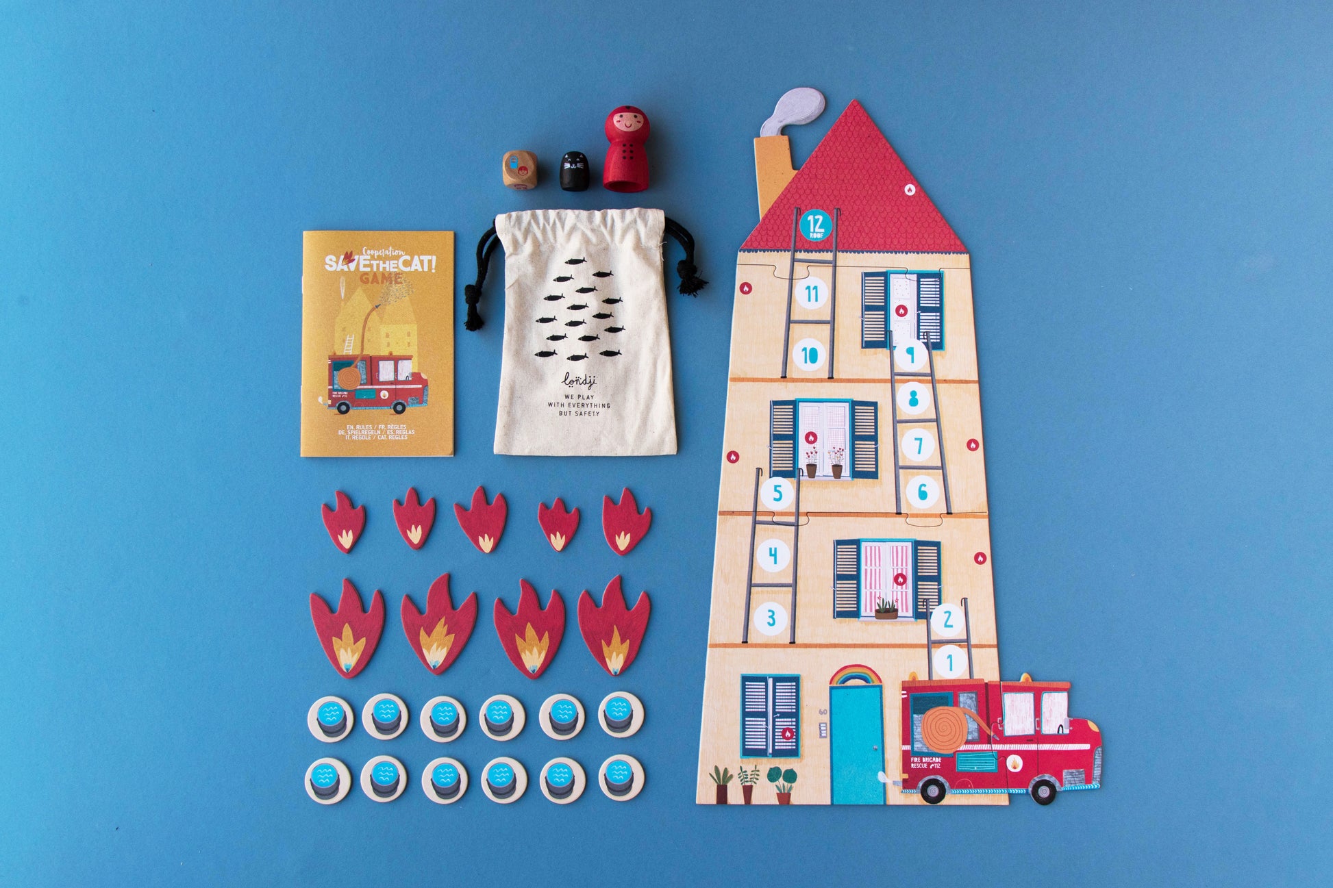 Aiuta i pompieri a spegnere l'incendio e salvare il gattino intrappolato sul tetto. In questo gioco diventiamo pompieri e lavoriamo insieme per spegnere gli incendi e raggiungere il tetto dove c'è un gattino intrappolato. Dobbiamo tenere gli occhi bene aperti e spruzzare molta acqua! Giocando ai pompieri, impariamo il processo decisionale di squadra, il conteggio e la pazienza. Un gioco da tavolo cooperativo e per famiglie in cui aiuteremo il pompiere a salvare il gatto intrappolato nell'incendio. Fatto con amore a Barcellona.