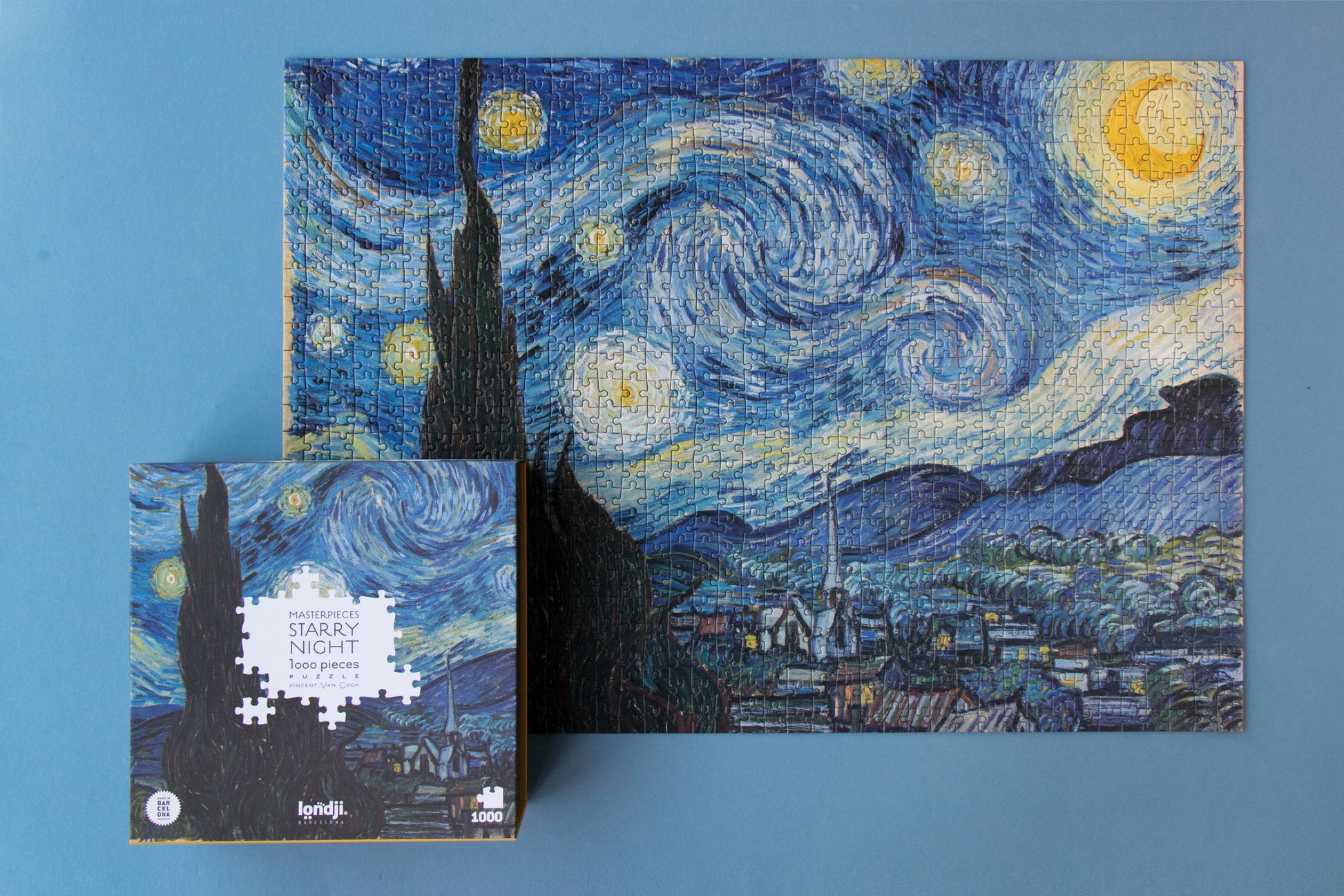 Un puzzle da 1000 pezzi per adulti del capolavoro la notte stellata di Vincent Van Gogh. Un puzzle sostenibile progettato e prodotto a Barcellona.