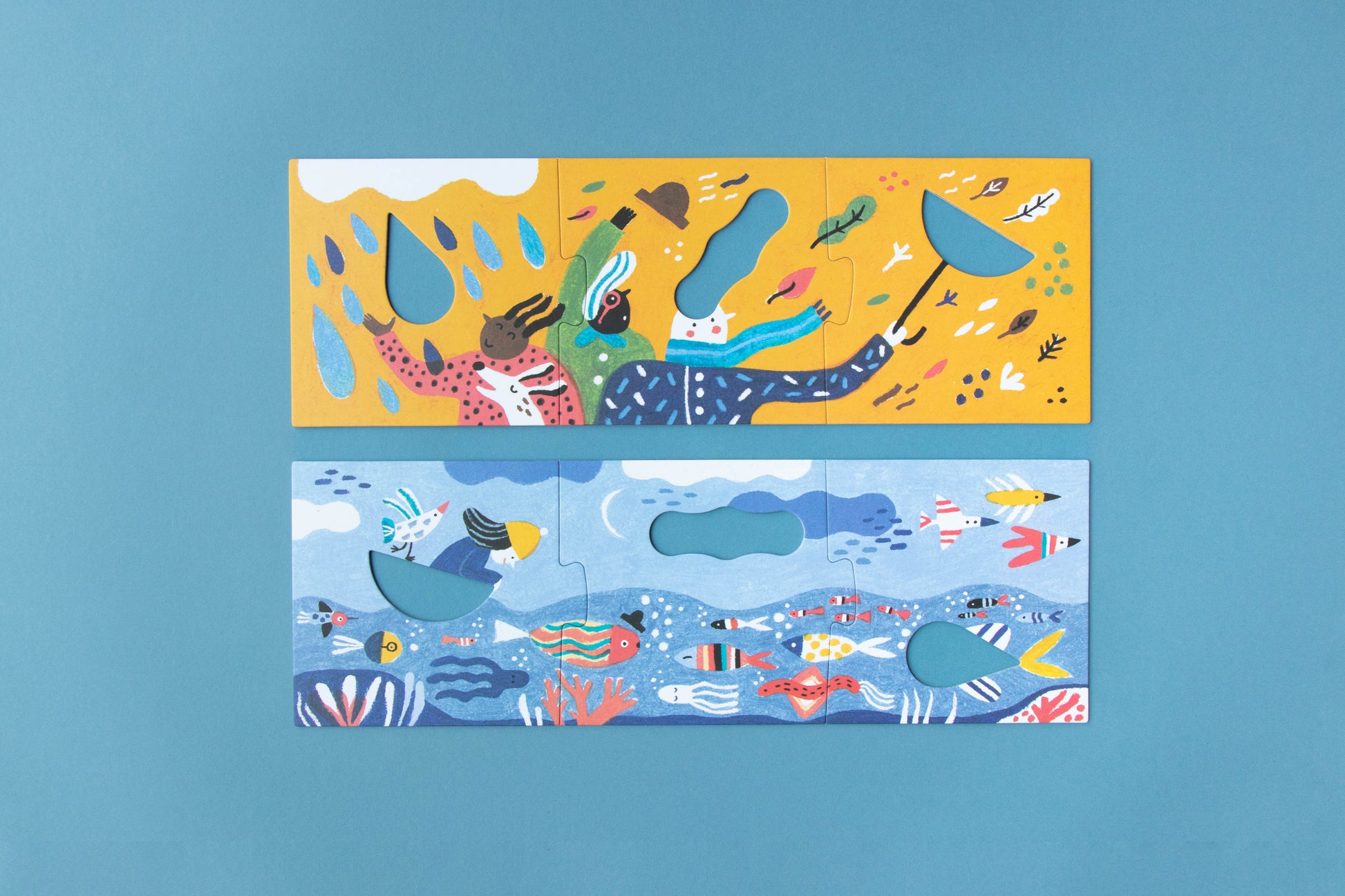 È la luna o una barca, una nuvola o un bruco, un pesce o una goccia d'acqua? Un gioco per l'immaginazione! Assembla i puzzle e inserisci i pezzi di legno. 4 puzzle di 3 pezzi grandi ciascuno con 3 pezzi di legno che cambiano significato a seconda dell'illustrazione in cui si inseriscono. Dai 2 anni.