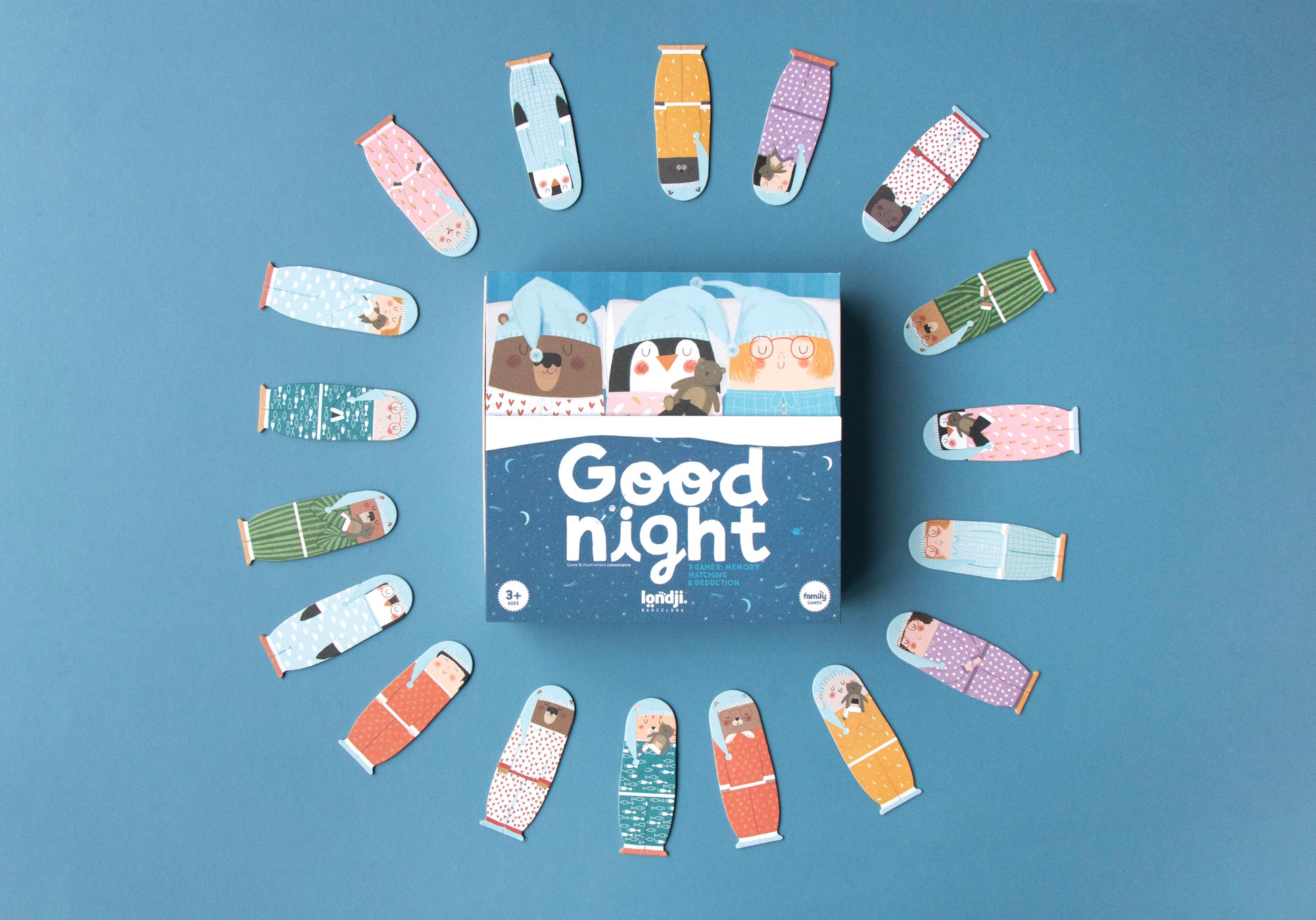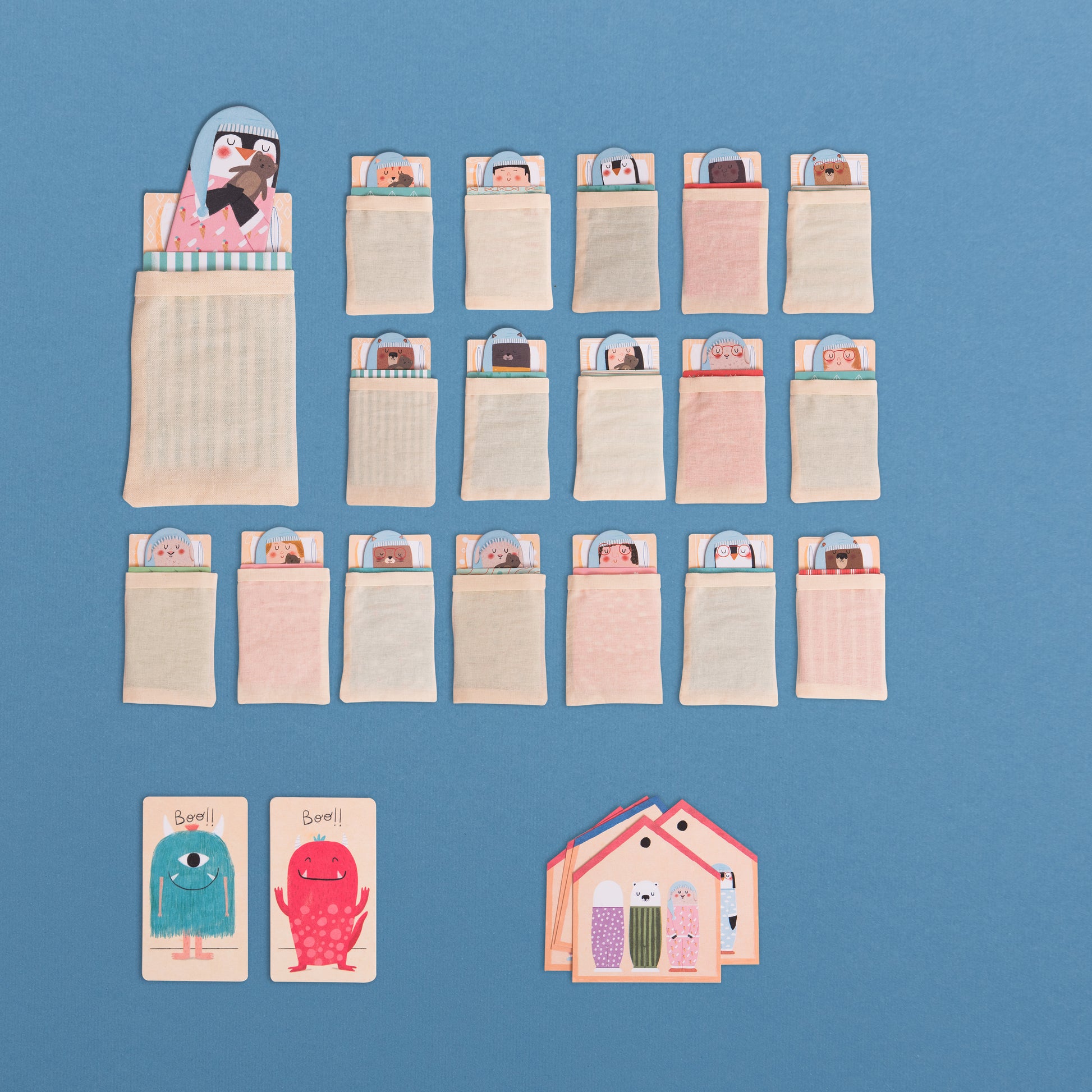 I nostri amici sognatori vanno a dormire. Chi indossa gli stessi pigiami? Chi dorme nella mia casa? Dove si trova il mostro sotto il letto? Buonanotte! Un gioco che può essere giocato in tre modi diversi: · Gioco di memoria: Con tutti i personaggi nei loro letti, devi trovare i personaggi che indossano gli stessi pigiami. · Le famiglie: Usando le carte a forma di casa, l'obiettivo per ogni giocatore è trovare tutti i membri di una famiglia in un singolo turno. · Il mostro sotto il letto: L'obiettivo è scoprire dove si nasconde il mostro sotto il letto. In questo gioco abbiamo bisogno di un giocatore capo, che sarà incaricato di nascondere un mostro e rispondere con "sì" o "no" alle domande degli altri giocatori, per esempio: "Il mostro sotto il letto è nel letto di un pinguino?" Un bellissimo gioco da tavolo per i membri più piccoli della famiglia con 3 modalità di gioco: memoria, abbinamento e deduzione. Un gioco sostenibile fatto con grande cura.