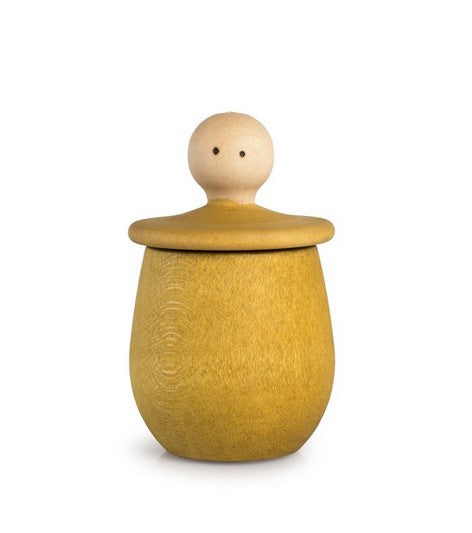 Scatola dei desideri gialla con una piccola figura all’interno.