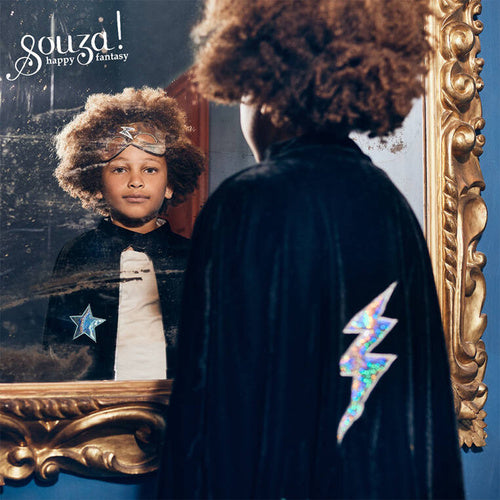 Mantello nero in velluto con fodera bianca, applicazioni olografiche a forma di luna e stelle. Chiusura a velcro sotto il collo.