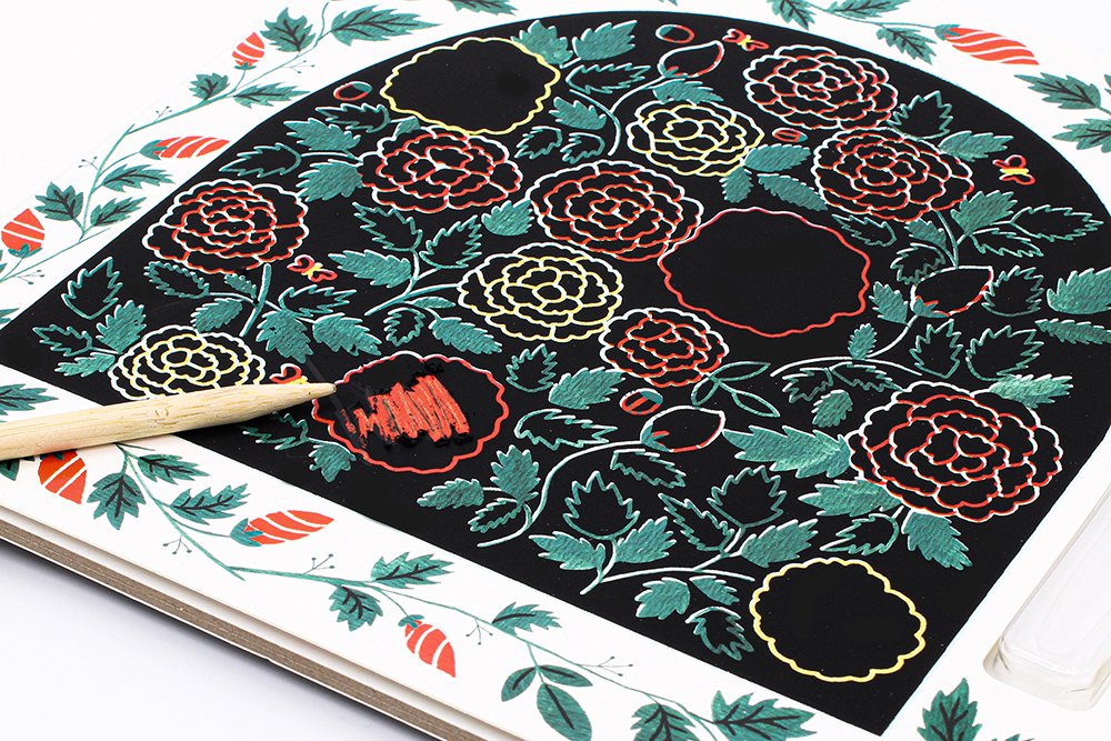 Lo stile dei Grattalibri di Dinara Mirtalipova, giovane designer uzbeka, ci trascinano nell'ultima tendenza creativa. Con l'apposita stilo si gratta la patina nera che ricopre le immagini. Spetta poi al piccolo artista decidere quanta superficie nera lasciare, svelando i meravigliosi disegni che nasconde. Benvenuti nel giardino incantato! Un uccellino riposa tra le foglie di un melo, una rana guazza nello stagno, coccinelle tra i petali di rose, bruchi pazzerelli mangiano foglie formando strani ghirigori...