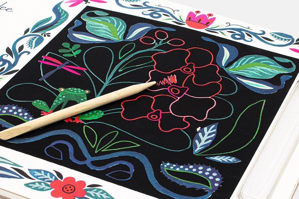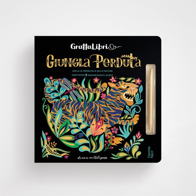 Lo stile dei Grattalibri di Dinara Mirtalipova, giovane designer uzbeka, ci trascinano nell'ultima tendenza creativa. Con l'apposita stilo si gratta la patina nera che ricopre le immagini. Spetta poi al piccolo artista decidere quanta superficie nera lasciare, svelando i meravigliosi disegni che nasconde. Esploriamo la giungla perduta animata da una flora coloratissima e da sgargianti animali: pappagalli, leopardi, orchidee, scimmie e colibrì.